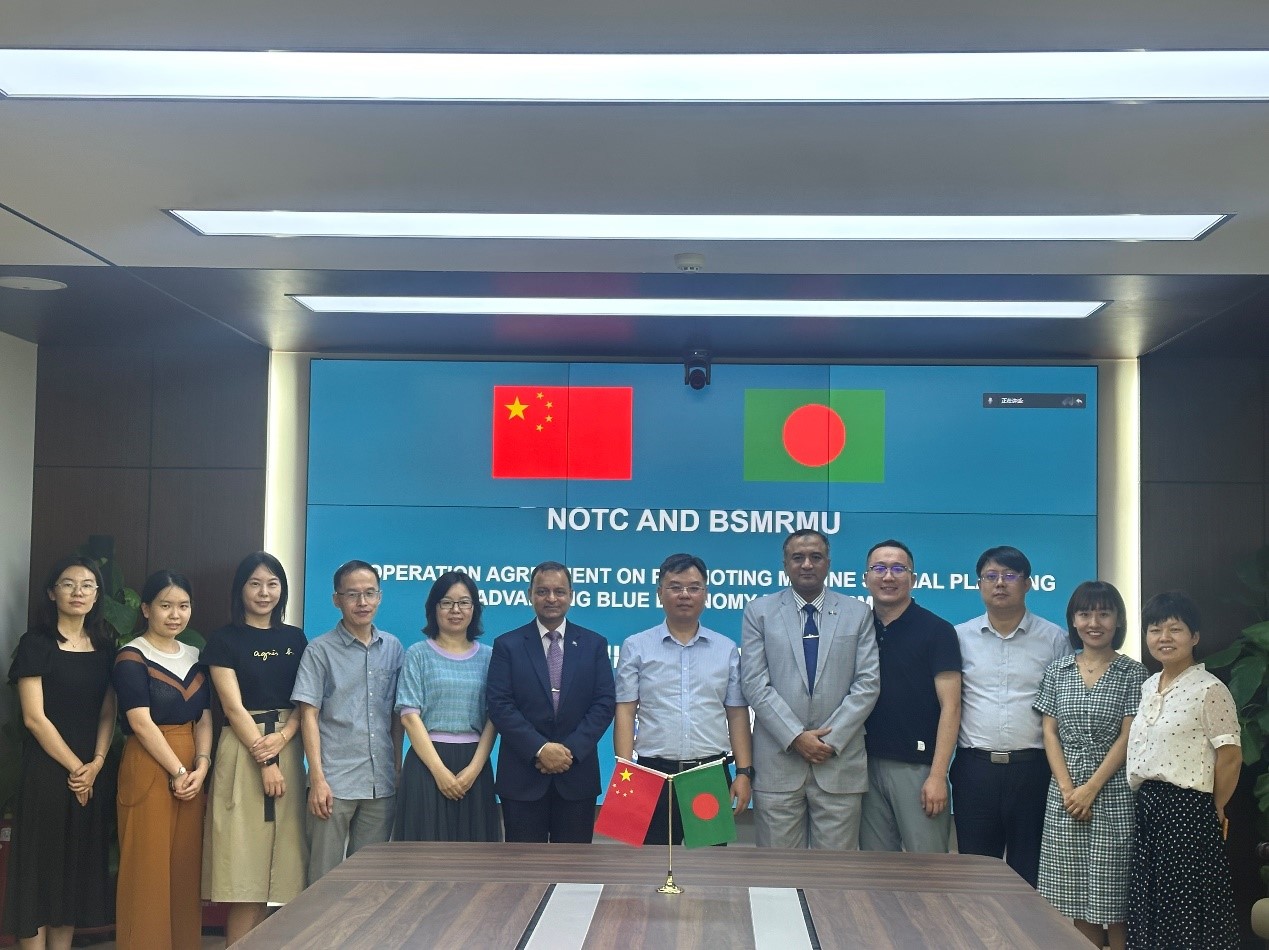 2023年8月9日,孟加拉國謝赫·穆吉布·拉赫曼海事大學執行校長穆罕穆德·穆薩海軍少將和特別代表納茨穆爾·哈桑指揮官一行對國家海洋技術中心進行訪問。中心主任、黨委書記彭偉與謝赫·穆吉布·拉赫曼海事大學執行校長穆罕穆德·穆薩簽署了《海洋空間規劃教育和研究合作協議》,開展“海洋空間規劃+藍色經濟”合作研討,積極落實兩國政府間簽署的《關于開展“一帶一路”倡議下合作諒解備忘錄》。