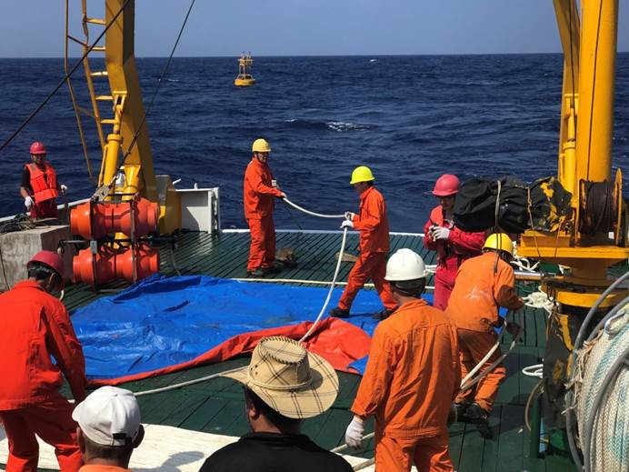 在2014年度海洋公益性行業科研重點專項“深遠海調查觀測重點基礎裝備產品化應用示范”項目支持下,我中心與天津市海華技術開發中心聯合研制的產品化深海錨系浮標于2018年4月1日在南海成功布放,并開始示范應用。