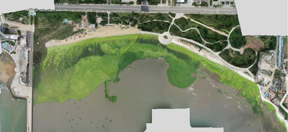 技術中心在前期調研,充分了解滸苔漂移及分布情況基礎上,迅速組織了9名技術人員,攜帶4架旋翼無人機,搭載可見光相機、攝像機和多光譜相機,對海陽老龍頭、乳山銀灘及東部海岸區域進行了無人機航拍,并通過移動監控指揮車實現了視頻實時回傳,進行數據快速處理,獲取了近岸滸苔災害態勢信息,共累計飛行12架次,監測面積約4平方公里。