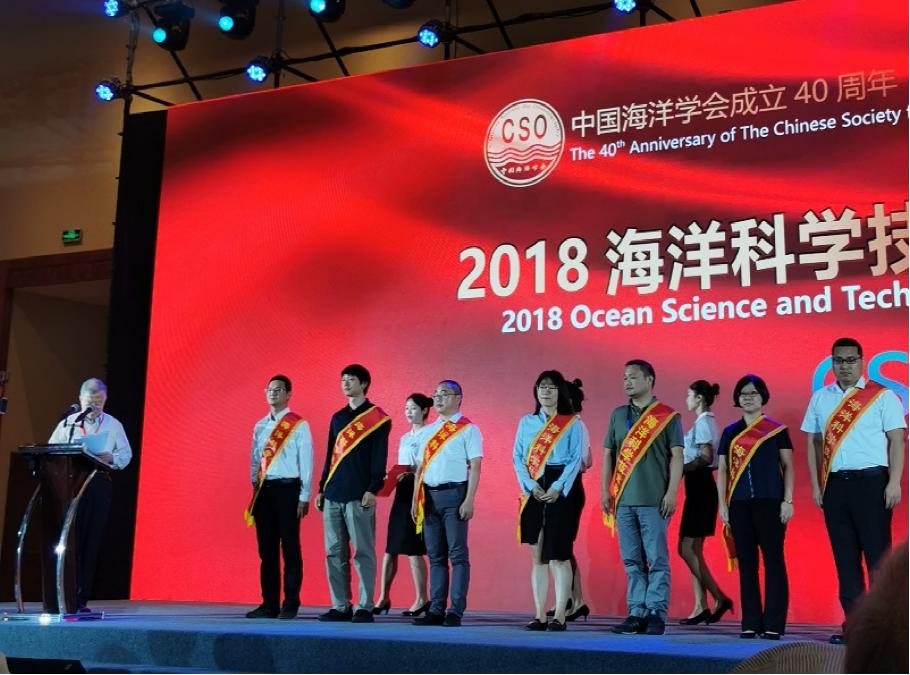 在頒獎環節,中國海洋和湖沼學會理事長孫松代表海洋科學技術獎共同設獎單位,宣讀了《關于獲得2018年海洋科學技術獎及2018年海洋優秀科技圖書的決定》。我中心“海洋能調查與評價關鍵技術標準化研究”獲得海洋科學技術獎二等獎,《中國海洋近海重點區資源分布圖集》獲得海洋優秀科技圖書獎。海洋科學技術獎獎勵委員會委員及評審專家代表丁磊、雷波、林明森、石綏祥、羅季燕為二等獎及海洋優秀科技圖書獲得者頒發證書。