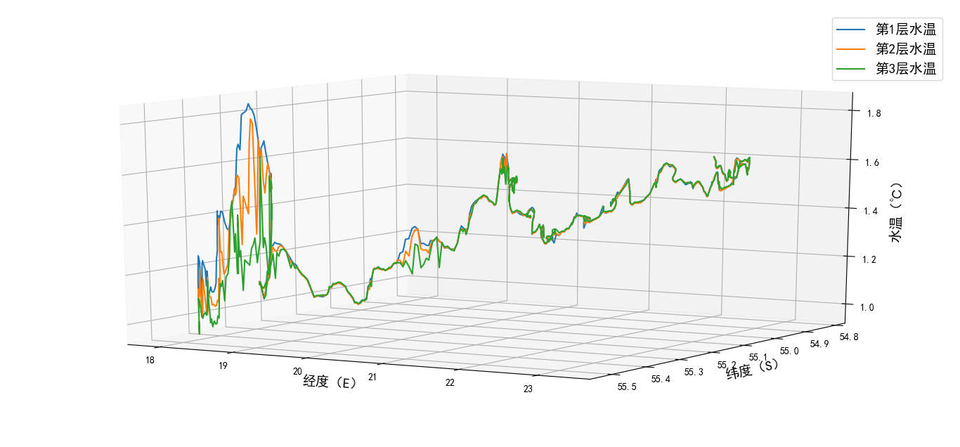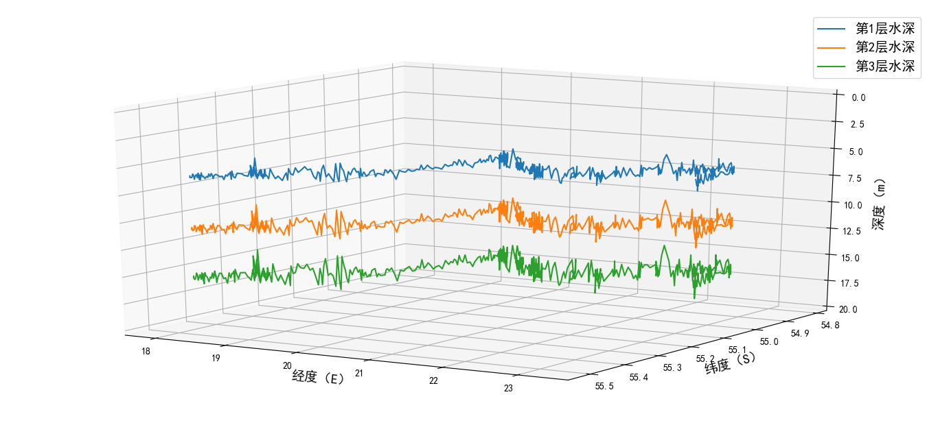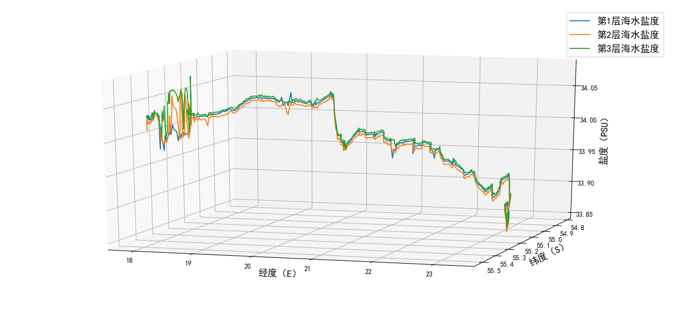 目前,浮標已在位運行近1個月,通過岸站接受到的數據繪制深度、溫度、鹽度隨漂流位置變化的三維曲線圖,可以看到,三臺儀器在纜上相對位置未發生改變,隨流深度變化趨勢一致;在布放初期的位置上,溫度和鹽度均有大幅波動,有較強的洋流,海水流動交換極快。