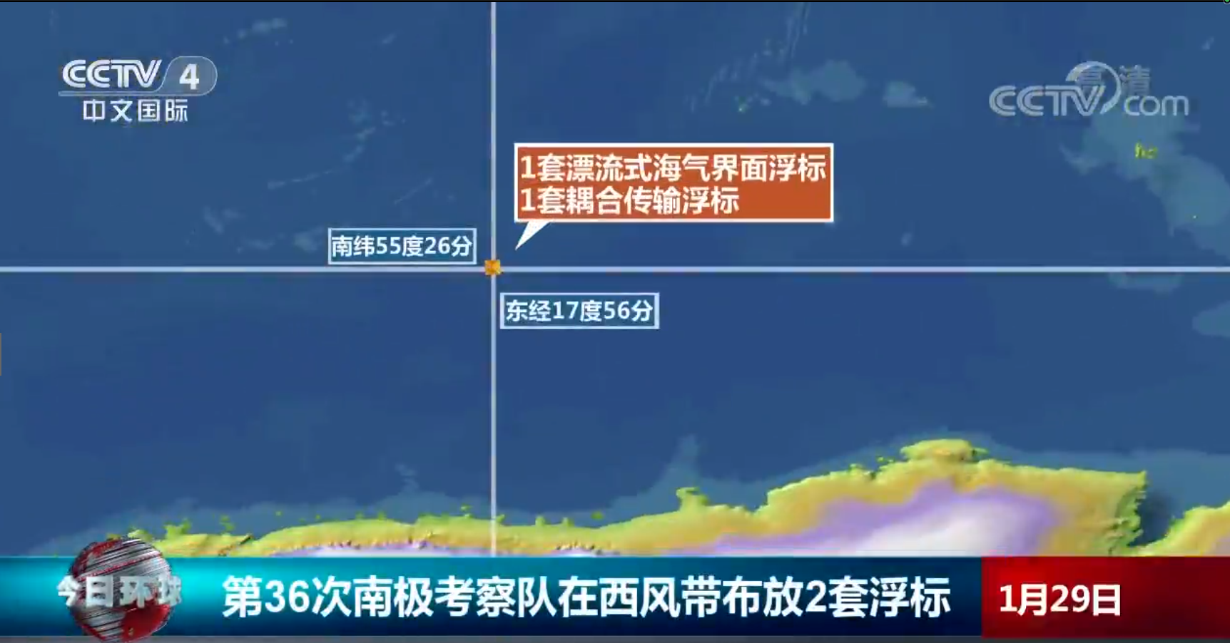 中國第36次南極科考隊搭載“雪龍2”號于1月27日在西風帶(南緯55度26分,東經17度56分)成功布放國家海洋技術中心自主知識產權產品兩套:感應耦合式表面漂流浮標和海氣界面漂流浮標,央視網、新華網均進行了專門報道。