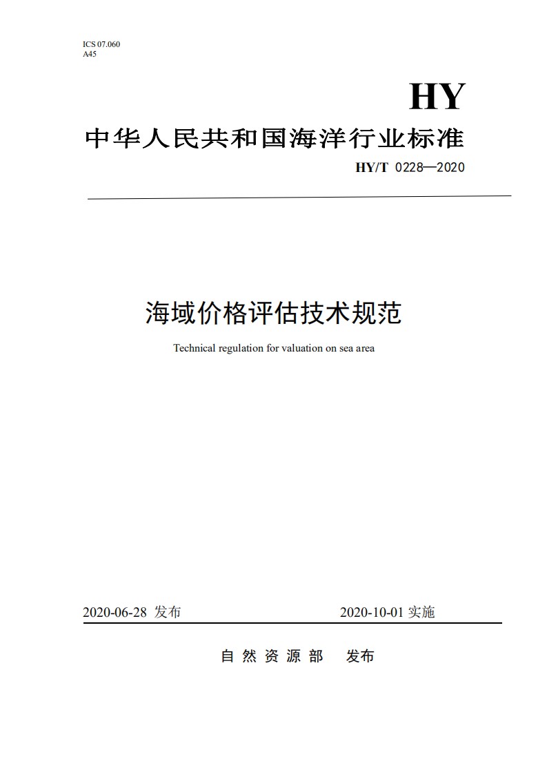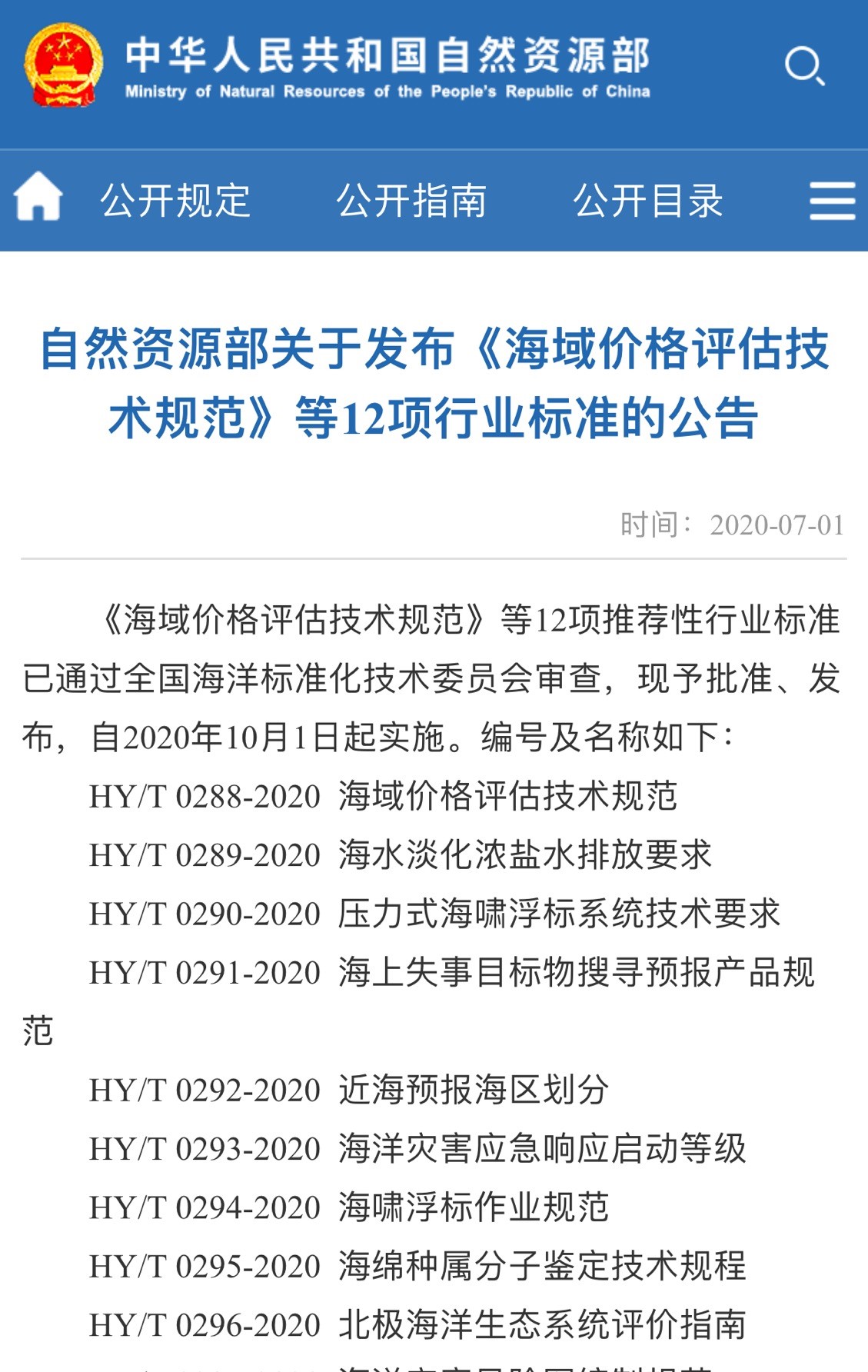 6月28日,《海域價格評估技術規范(HY/T 0288-2020)》推薦性行業標準獲自然資源部批準發布,將于2020年10月1日起實施。《規范》在自然資源部海域海島管理司指導下,由國家海洋技術中心承擔起草。