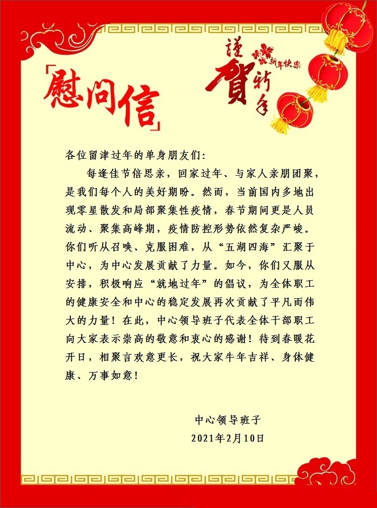 中心廣大單身職工“舍小家顧大家”,積極響應(yīng)“就地過年”的倡議,為中心全體職工健康安全和中心的穩(wěn)定發(fā)展貢獻(xiàn)了平凡而偉大的力量。中心領(lǐng)導(dǎo)班子通過慰問信,表達(dá)了對他們響應(yīng)號召、就地過年的行動的充分肯定,向默默支持他們的家人們表示衷心感謝,并致以新春佳節(jié)的問候。相關(guān)部門認(rèn)真落實中心黨委關(guān)于做好留津單身職工就地過年服務(wù)保障工作的部署,為中心留津過年的23位單身職工送去了一份天津傳統(tǒng)糕點,讓單身職工們留津也能感受到在家團圓的溫暖和濃濃的年味,為他們送去黨的溫暖和組織的關(guān)愛。(辦公室、黨辦、工會)