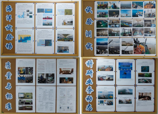 宣傳欄包括業務工作與科研動態兩個方面,內容豐富、形式靈活、圖文并茂,包括“海洋試驗場”、“試驗測試”、“質量與標準”和“科研業務動態”四個板塊。“海洋試驗場”板塊系統展示了國家海洋綜合試驗場的規劃、布局,以及各場區的規劃與建設情況;“試驗測試”板塊展示了基于海洋試驗場與實驗室開展的試驗測試、海洋能發電裝置性能現場測試過程影集;“質量與標準”板塊展示了質量檢驗和計量溯源工作的技術能力、設備設施、人員資質以及分標委會的標準化工作情況;“科研業務動態”板塊展示了試驗場中心近期的科研工作進展與業務工作成果。