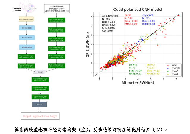 針對現有高分三號衛星SAR遙感數據海浪有效波高反演方法流程復雜、精度不高的問題,王賀副研究員與國家衛星海洋應用中心林明森研究員、自然資源部第二海洋研究所楊勁松研究員合作,通過深度挖掘全極化SAR數據中的交叉譜信息,以及同極化/交叉極化雷達后向散射信息,提出了一種基于殘差卷積神經網絡的高分三號衛星全極化SAR數據有效波高反演算法,實現了高分三號SAR海浪有效波高參數的高精度、快速反演。研究表明,衛星高度計觀測數據相比,該算法均方根誤差為0.32米,與現有文獻中算法精度提高了約50%。(航空部 王賀)