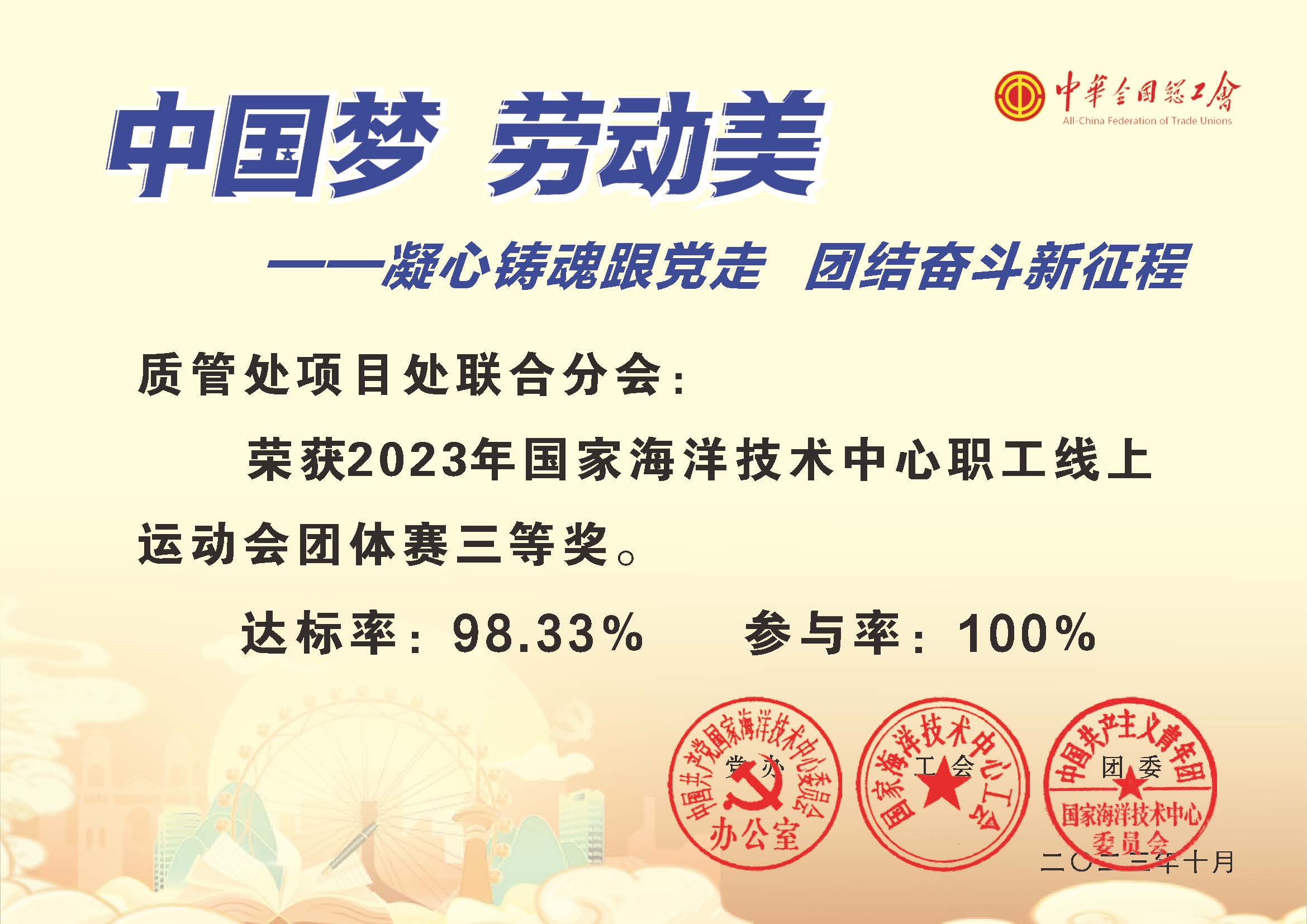 在同期開展的中心線上運動會中,綜合分會參與率和達標率兩個數據,海洋能項目辦分會總排名第一榮獲“一等獎”,試驗場中心分會、黨辦紀辦分會獲“二等獎”,監控中心分會、質管處項目處分會、海保部分會獲“三等獎”,中心有157人30天全部達標獲“全勤獎”。