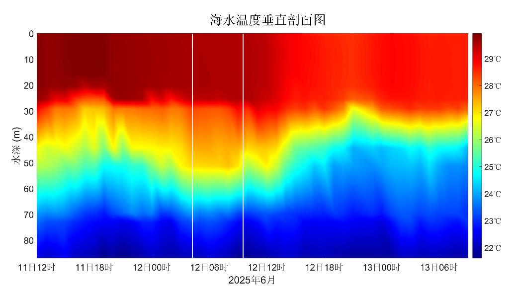 浮標(biāo)此次捕獲的數(shù)據(jù)能夠有力支撐對臺風(fēng)的氣象、水文、生態(tài)及上層海洋海流、溫鹽演變過程的分析。6月12日6時左右,“蝴蝶”臺風(fēng)中心抵達浮標(biāo)所在海域,中心最低氣壓987hPa。過境后,風(fēng)速急劇增大,浮標(biāo)觀測到最大風(fēng)速22.7m/s,最大波高7.8m。浮標(biāo)剖面觀測數(shù)據(jù)顯示,受臺風(fēng)影響,上層海洋混合加劇,水溫下降,鹽度降低,流速增強,混合層深度明顯加深。